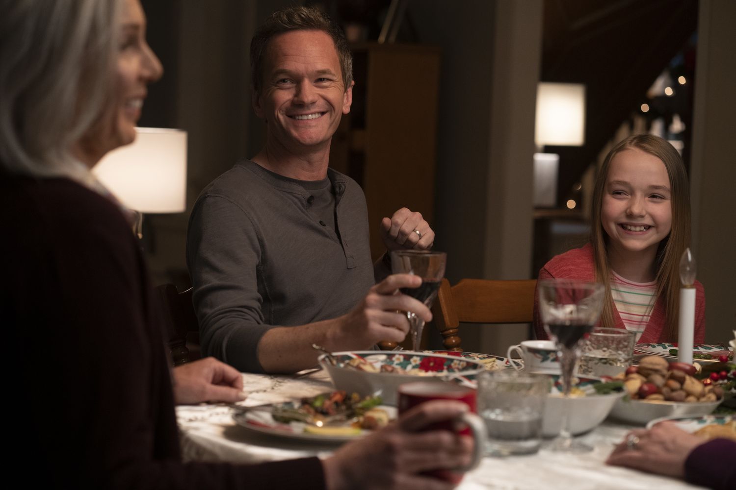 (L-r) JUNE DIANE RAPHAEL as Kathy Doyle, NEIL PATRICK HARRIS as Jake Doyle and SOPHIA REID-GANTZERT as Annie Doyle in New Line Cinema and HBO Max’s family film “8-BIT CHRISTMAS.”