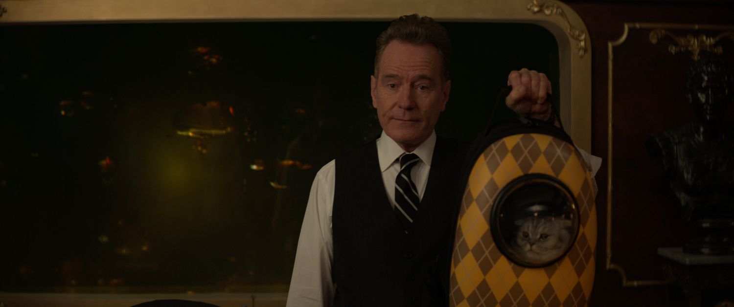 Ritter (Bryan Cranston) and Alfie the Cat (Chip) in Argylle, directed by Matthew Vaughn.