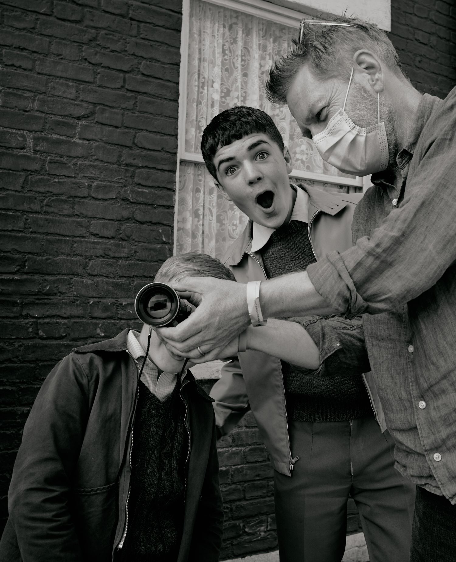 (L to R) Actor Jude Hill, actor Lewis McAskie and writer/director Kenneth Branagh on the set of BELFAST, a Focus Features release. Credit: Rob Youngson/Focus Features