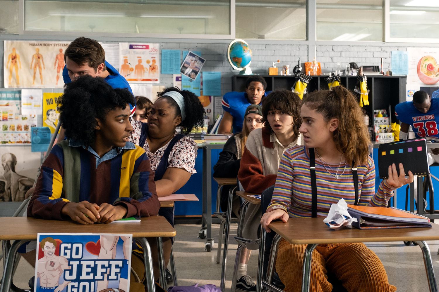 (l-r.) Ayo Edebiri stars as Josie, Nicholas Galitzine as Jeff, Zamani Wilder as Annie, Summer Joy Campbell as Sylvie, Ruby Cruz as Hazel and Rachel Sennott as PJ in BOTTOMS An Orion Pictures Release