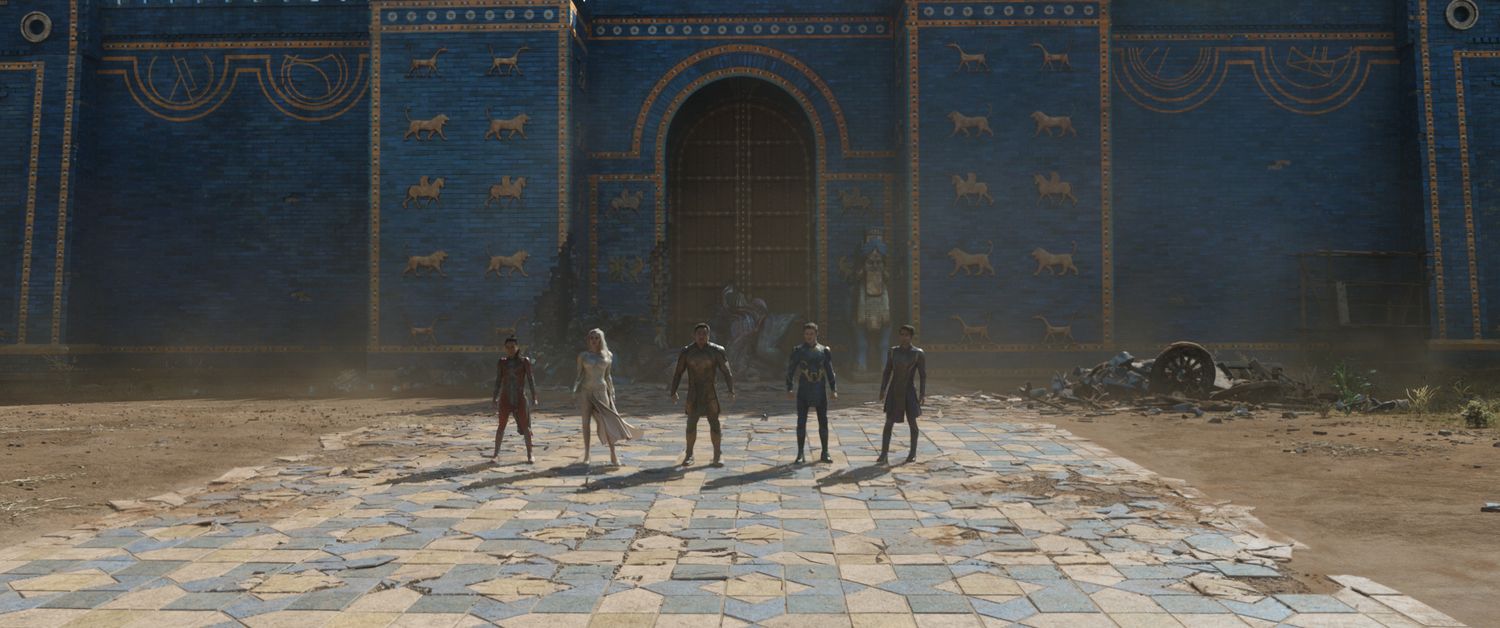 (L-R): Makkari (Lauren Ridloff), Thena (Angelina Jolie), Gilgamesh (Don Lee), Ikaris (Richard Madden) and Kingo (Kumail Nanjiani) in Marvel Studios' ETERNALS. Photo courtesy of Marvel Studios. ©Marvel Studios 2021. All Rights Reserved.