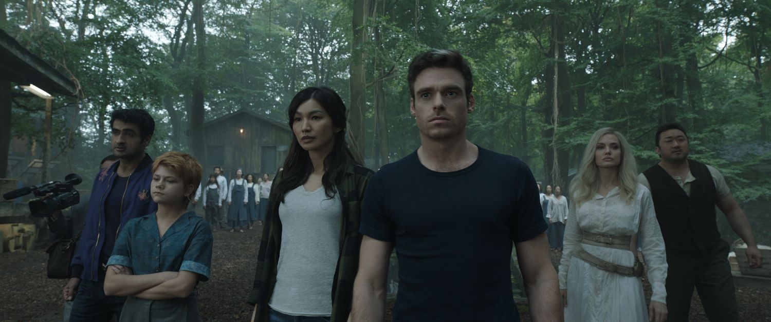 (L-R): Karun (Harish Patel), Kingo (Kumail Nanjiani), Sprite (Lia McHugh), Sersi (Gemma Chan), Ikaris (Richard Madden), Thena (Angelina Jolie), Gilgamesh (Don Lee) in Marvel Studios' ETERNALS. Photo courtesy of Marvel Studios. ©Marvel Studios 2021. All Rights Reserved.