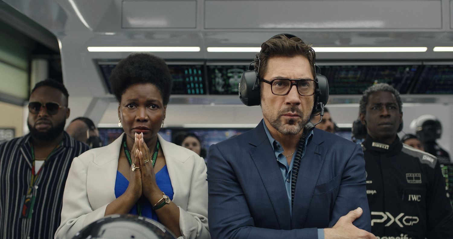 (L-r) SAMSON KAYO as Cash, SARAH NILES as Bernadette, JAVIER BARDEM as Ruben Cervantes and ABDUL SALIS as Dodge in Apple Original Films’ “F1® The Movie,” a Warner Bros. Pictures release. (PRESS KIT)