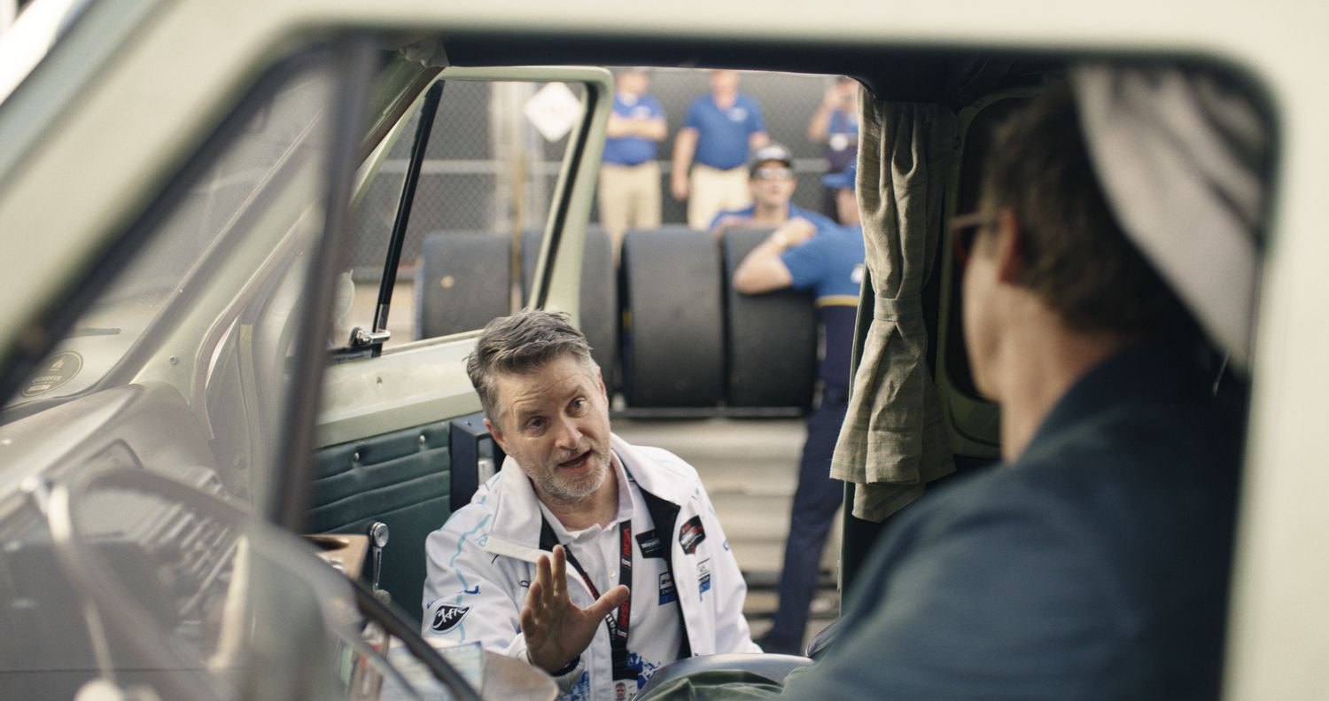 (L-r) SHEA WIGHAM as Chip Hart/Chief Mechanic/Daytona and BRAD PITT as Sonny Hayes in Apple Original Films’ “F1® The Movie,” a Warner Bros. Pictures release. (PRESS KIT)