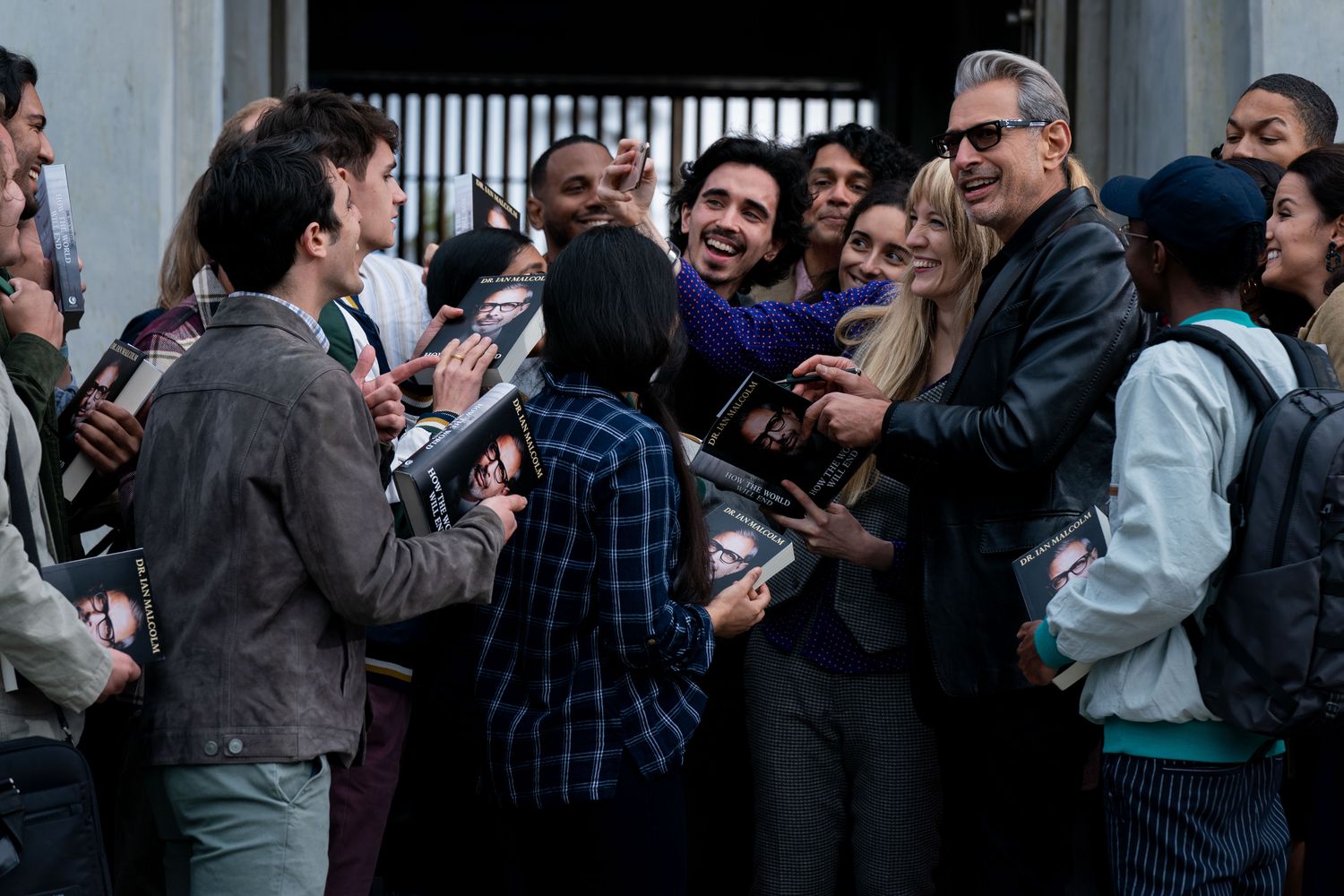 Dr. Ian Malcolm (Jeff Goldblum) and screenwriter Emily Carmichael in a cameo (left of Goldblum) in Jurassic World Dominion, co-written and directed by Colin Trevorrow.