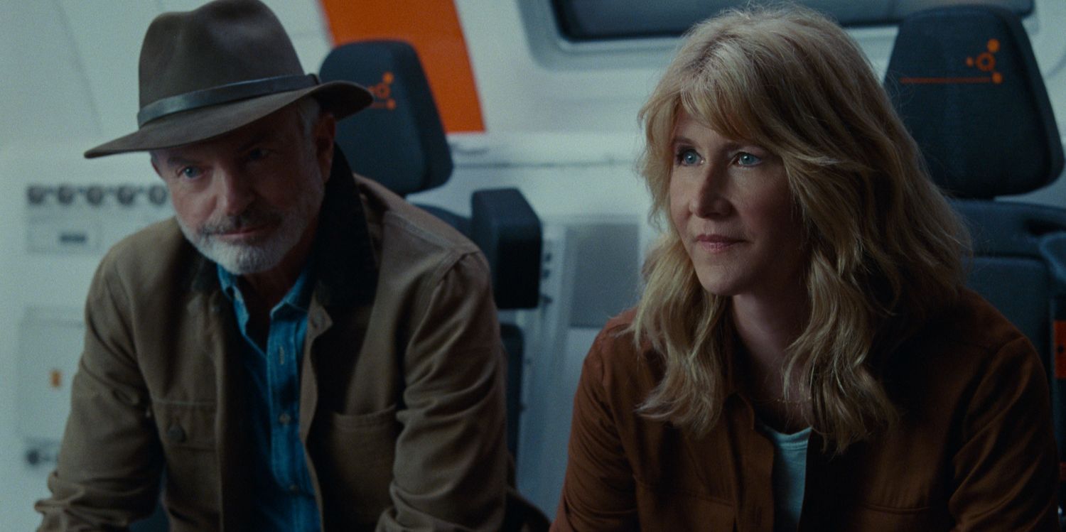(from left) Dr. Alan Grant (Sam Neill) and Dr. Ellie Sattler (Laura Dern) in Jurassic World Dominion, co-written and directed by Colin Trevorrow.