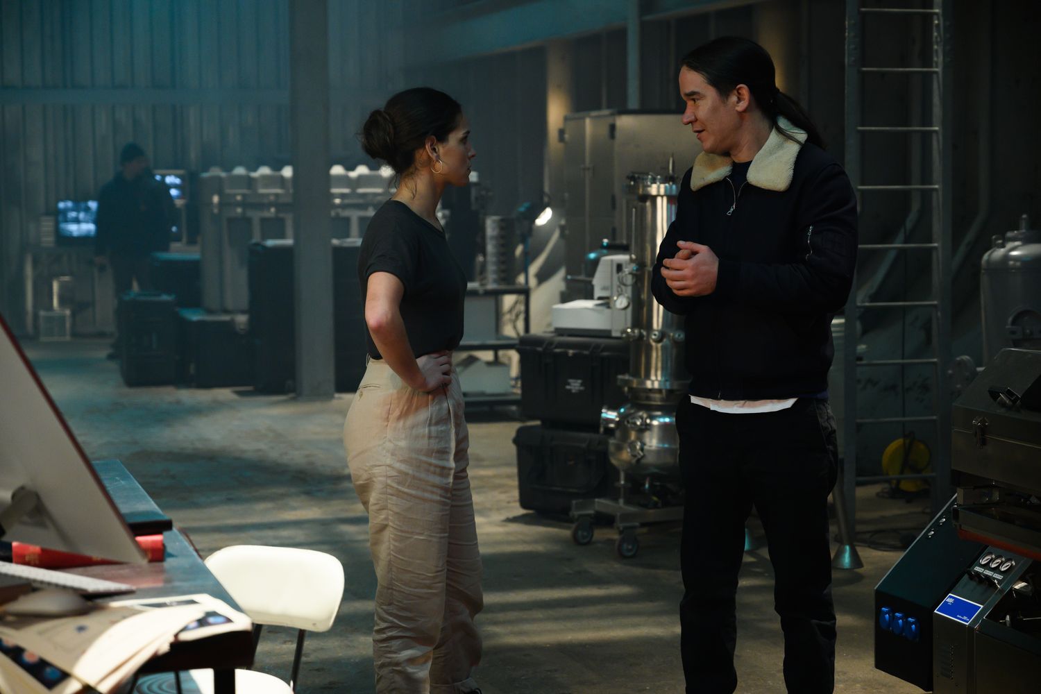 Adria Arjona and Director Daniel Espinosa on the set of Columbia Pictures' MORBIUS.