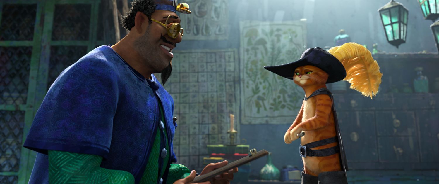 (from left) Doctor (Anthony Mendez) and Puss in Boots (Antonio Banderas) in DreamWorks Animation’s Puss in Boots: The Last Wish, directed by Joel Crawford.