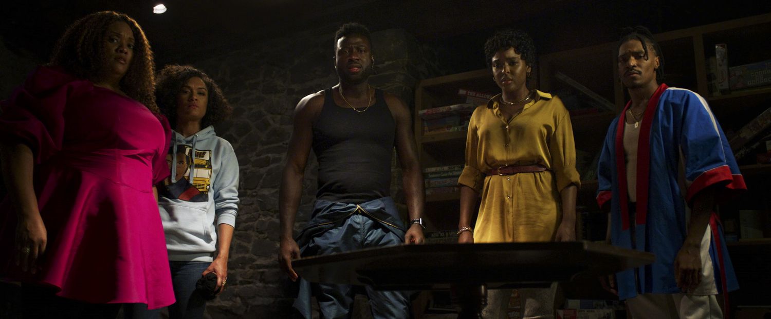 X Mayo as Shanika, Grace Byers as Allison, Sinqua Walls as Nnamdi, Antoinette Robertson as Lisa, and Dewayne Perkins as Dewayne in The Blackening. Photo Credit: Courtesy of Lionsgate