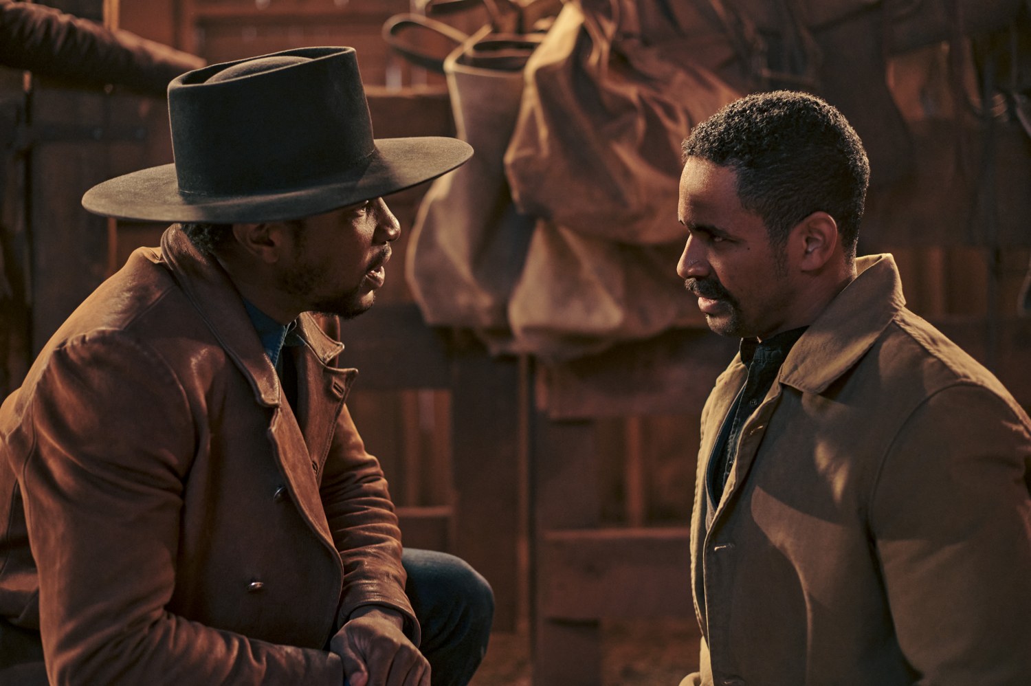 THE HARDER THEY FALL (L to R): JONATHAN MAJORS as NAT LOVE and DAMON WAYANS JR as MONROE GRIMES in THE HARDER THEY FALL Cr. DAVID LEE/NETFLIX © 2021