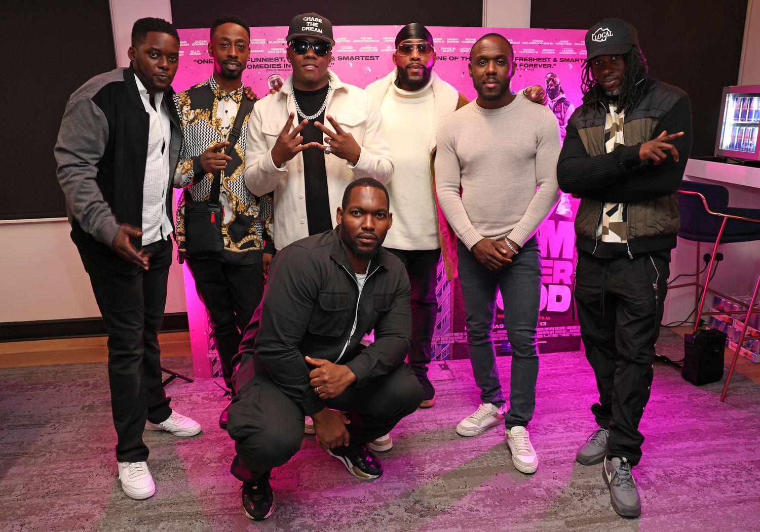 LONDON, ENGLAND - OCTOBER 11: (L-R) Marlon Flawless, Kule T, Mo George and the More Fire Crew attend the first of its kind, live gaming stream event at Dolby Screening Room, followed by an exclusive screening of the new Paramount Pictures film "Sumotherhood" on October 11, 2023 in London, England. (Photo by Tristan Fewings/Getty Images for Paramount Pictures UK)