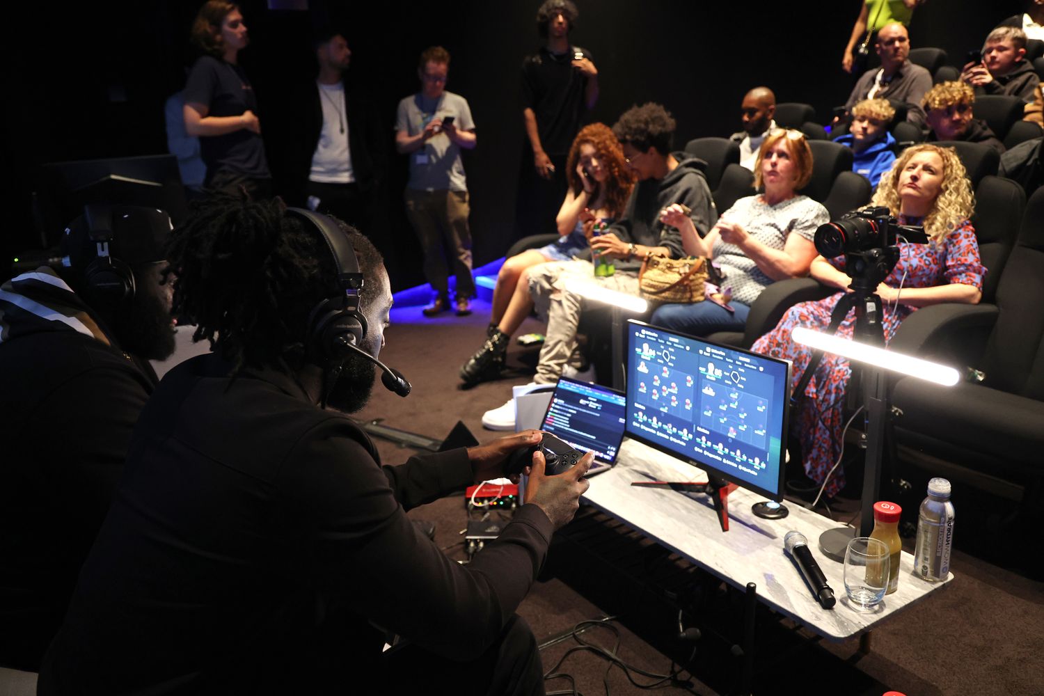 LONDON, ENGLAND - OCTOBER 11: Jazzie Zonzolo and P Money take part in the first of its kind, live gaming stream event at Dolby Screening Room, followed by an exclusive screening of the new Paramount Pictures film "Sumotherhood" on October 11, 2023 in London, England. (Photo by Tristan Fewings/Getty Images for Paramount Pictures UK)