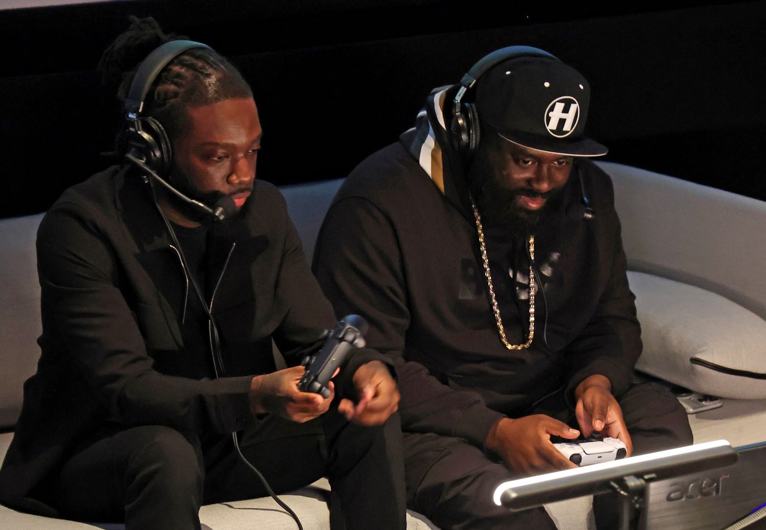 LONDON, ENGLAND - OCTOBER 11: Jazzie Zonzolo and P Money take part in the first of its kind, live gaming stream event at Dolby Screening Room, followed by an exclusive screening of the new Paramount Pictures film "Sumotherhood" on October 11, 2023 in London, England. (Photo by Tristan Fewings/Getty Images for Paramount Pictures UK)