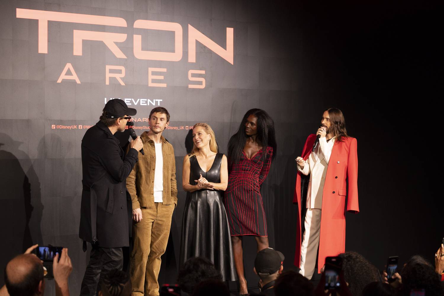 (L to R) Joachim Rønning, Evan Peters, Gillian Anderson, Jodie Turner-Smith and Jared Leto attend the UK Event of Disney’s 'Tron: Ares' at Piccadilly Lights, London on October 1st, 2025. (Photo by StillMoving.Net for The Walt Disney Company Limited)