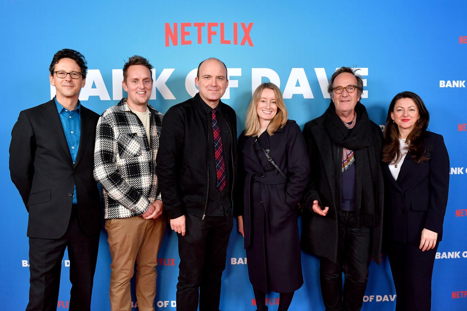 BURNLEY, ENGLAND - JANUARY 15: Producer Piers Tempest, director Chris Foggin, Rory Kinnear, co-producer Lauren Cox, writer Piers Ashworth and Jo Hartley attend the world premiere of Netflix's "Bank of Dave" on January 15, 2023 in Burnley, England. (Photo by Anthony Devlin/Getty Images for Netflix)
