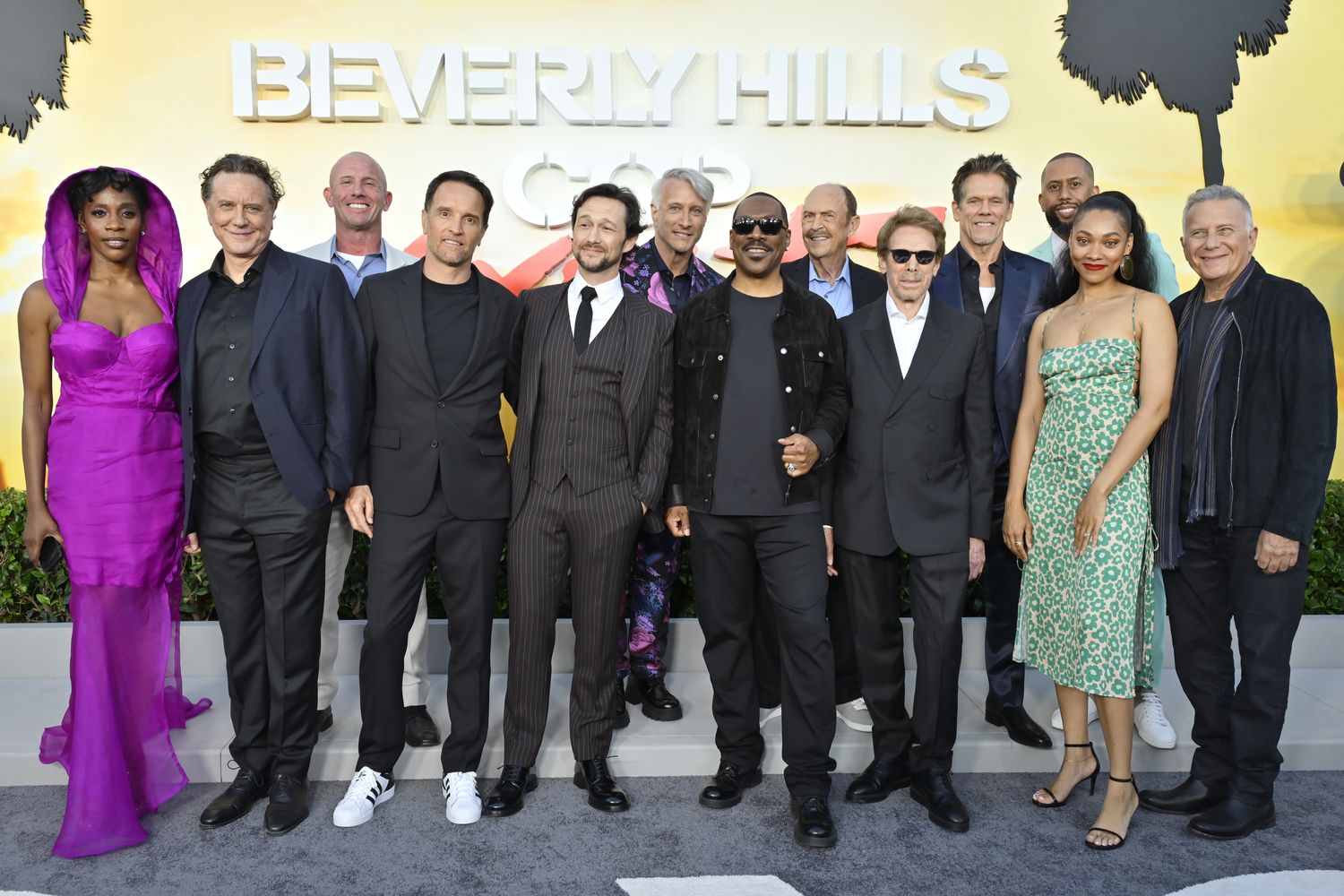 BEVERLY HILLS, CALIFORNIA - JUNE 20: (L-R) Chantal Nchako, Judge Reinhold, Will Beall, Mark Molloy, Joseph Gordon-Levitt, Bronson Pinchot, Eddie Murphy, John Ashton, Jerry Bruckheimer, Kevin Bacon, Affion Crockett, Bria Murphy and Paul Reiser attend the Beverly Hills Cop: Axel F World Premiere at Wallis Annenberg Center for the Performing Arts on June 20, 2024 in Beverly Hills, California. (Photo by John Sciulli/Getty Images for Netflix)
