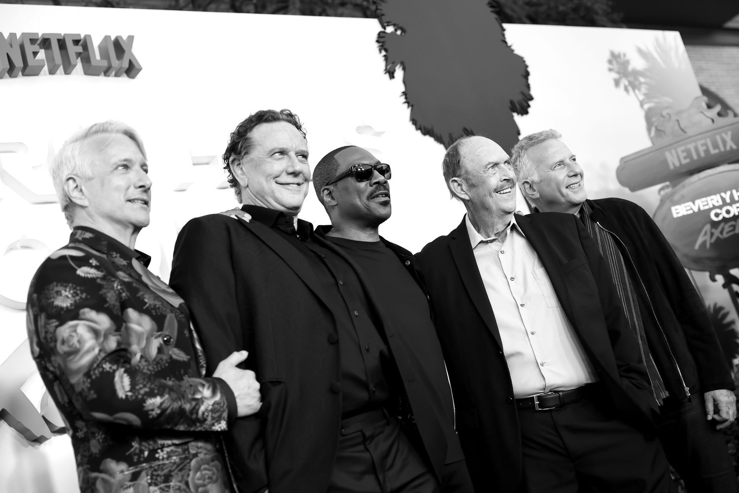 BEVERLY HILLS, CALIFORNIA - JUNE 20: (EDITORS NOTE: Image has been shot in black and white. Color version not available.) (L-R) Bronson Pinchot, Judge Reinhold, Eddie Murphy, John Ashton and Paul Reiser attend the Beverly Hills Cop: Axel F World Premiere at Wallis Annenberg Center for the Performing Arts on June 20, 2024 in Beverly Hills, California. (Photo by Emma McIntyre/Getty Images for Netflix)